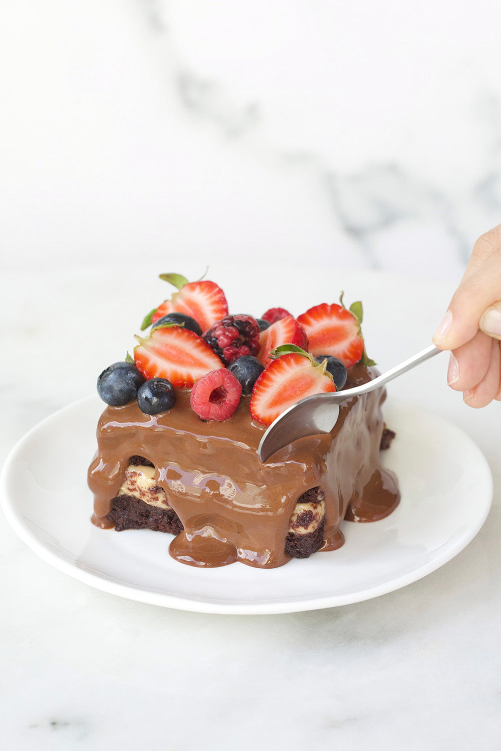 Porción individual de torta de chocolate, relleno de manjar de olla y fudge artesanal. Lleva mix de frutos rojos de temporada.