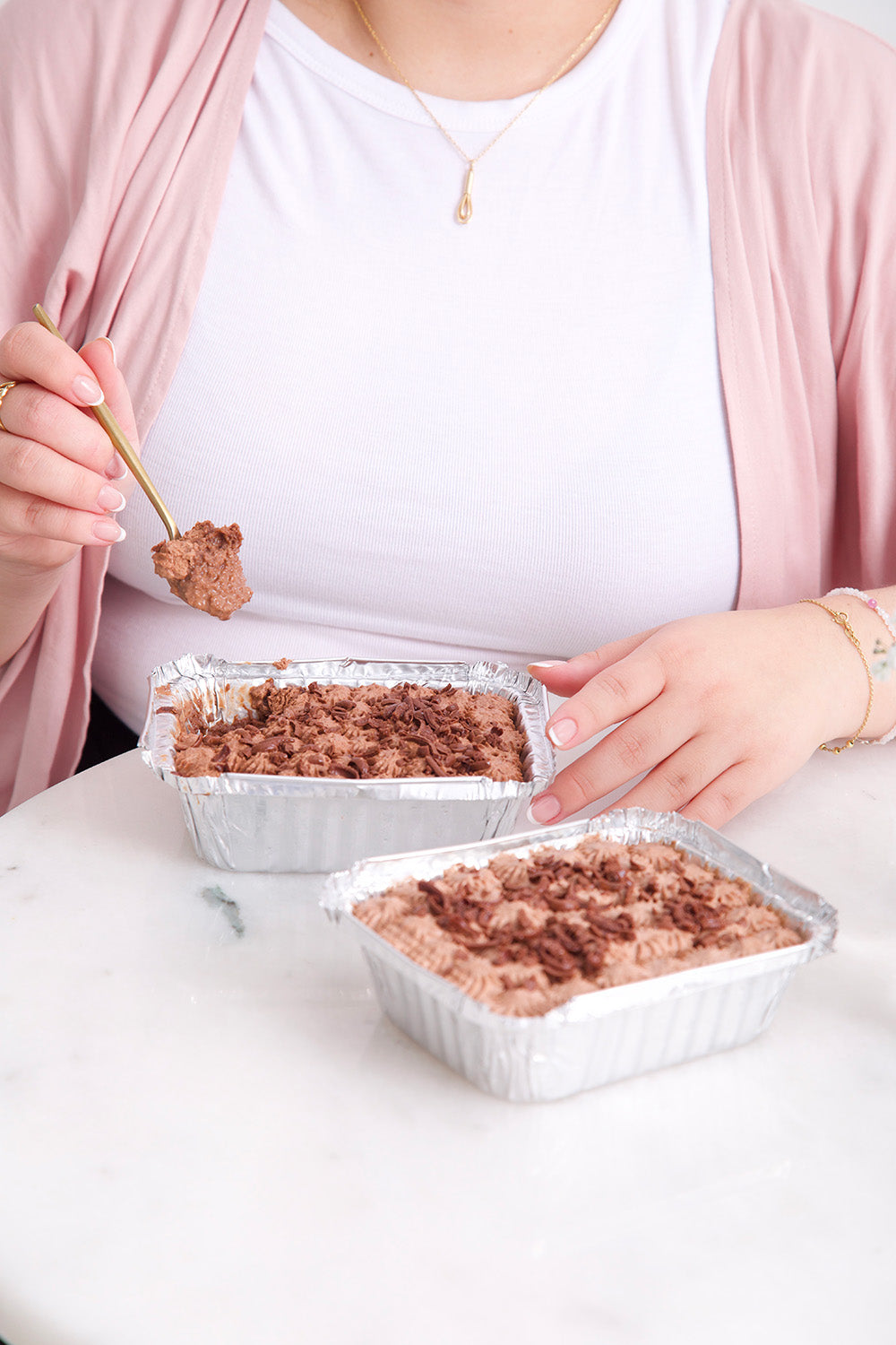 Porción individual en envase de aluminio. Bizcocho de chocolate embebido con tres tipos de leche, lleva crema batida de chocolate encima.