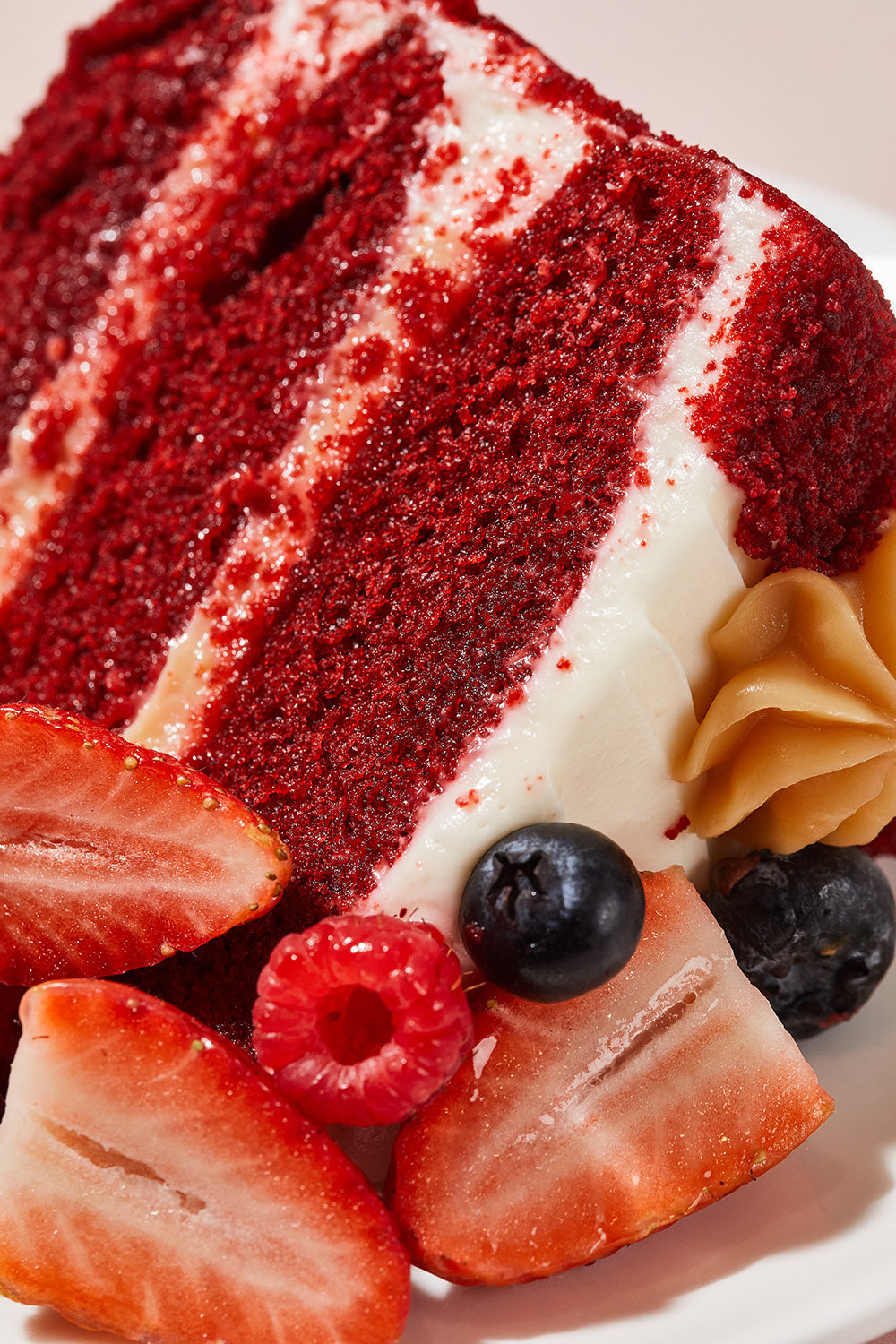 Porción individual de red velvet rellena de manjar de olla y bañada con frosting de queso crema. Lleva frutos rojos de temporada.