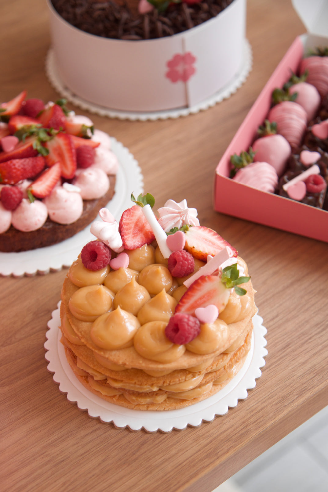 Capas de alfajor de harina con mantequilla con relleno de manjar de olla. Decorado con media luna de frutos rojos y merenguitos.