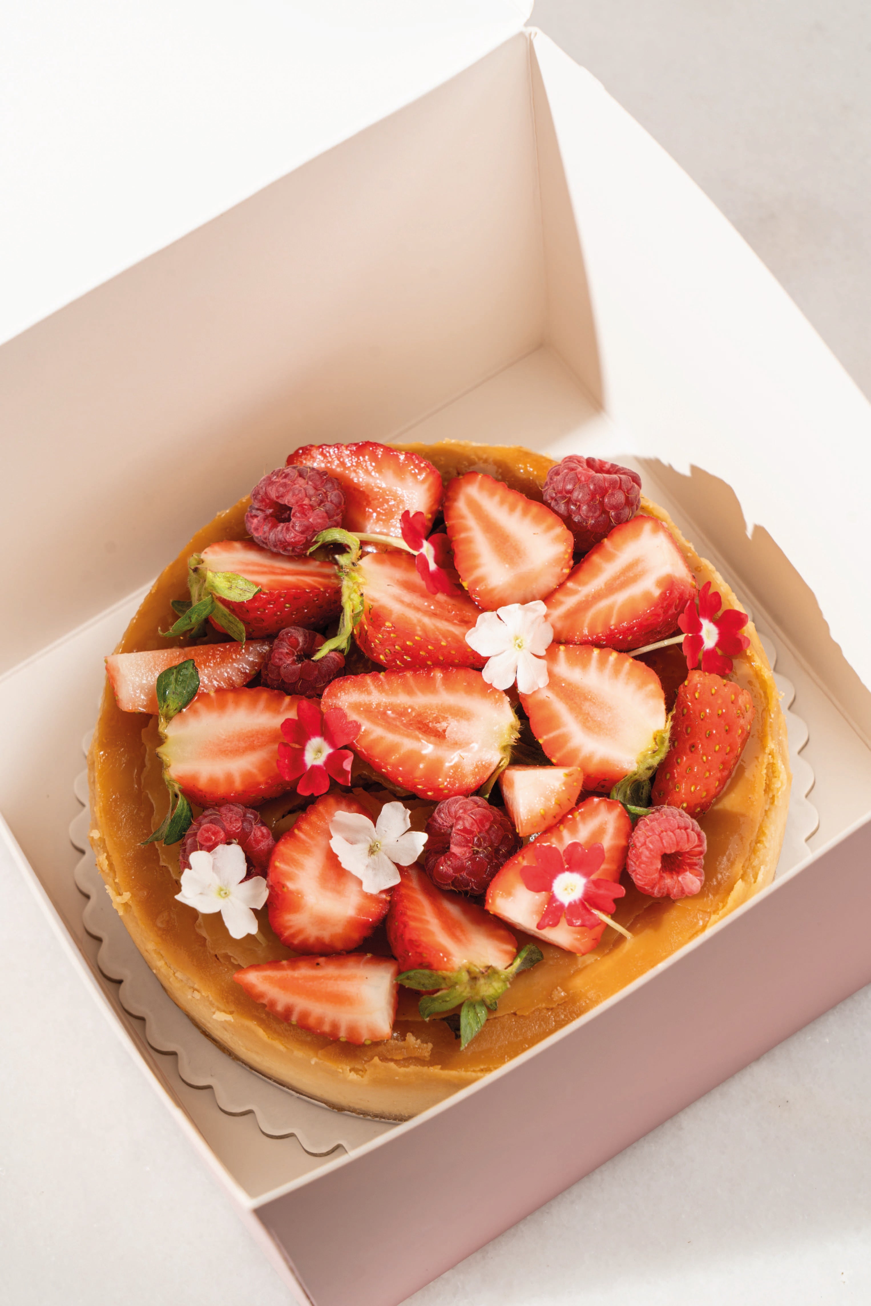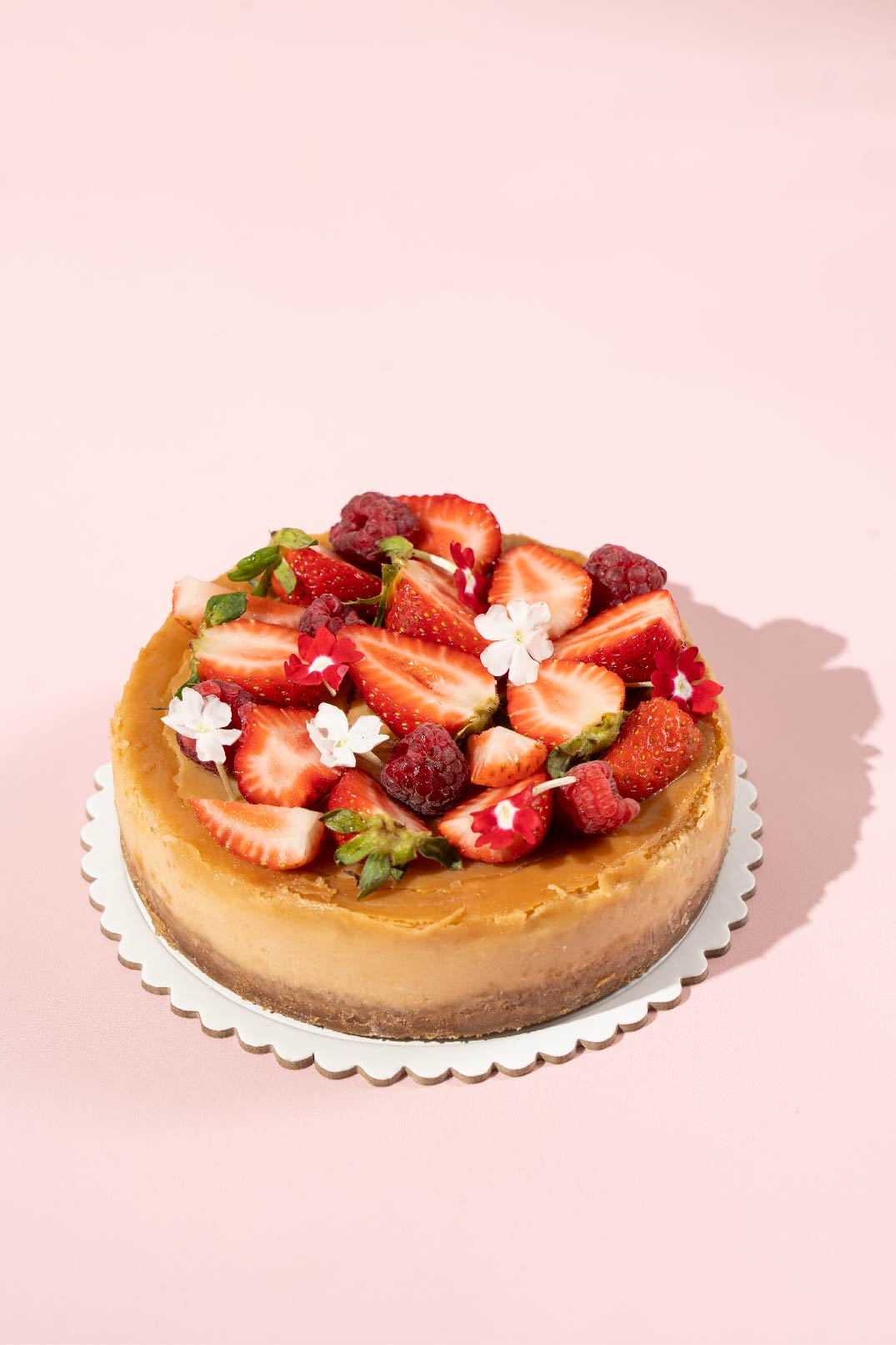 A base de puro queso crema y base de galleta de vainilla, compota y fresas frescas.