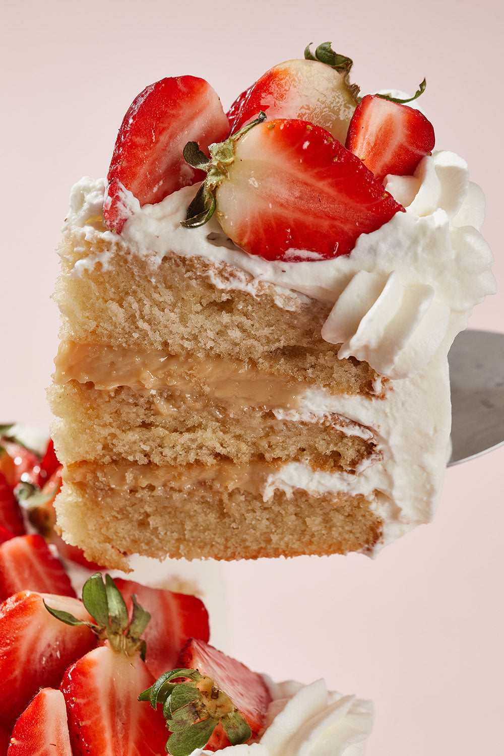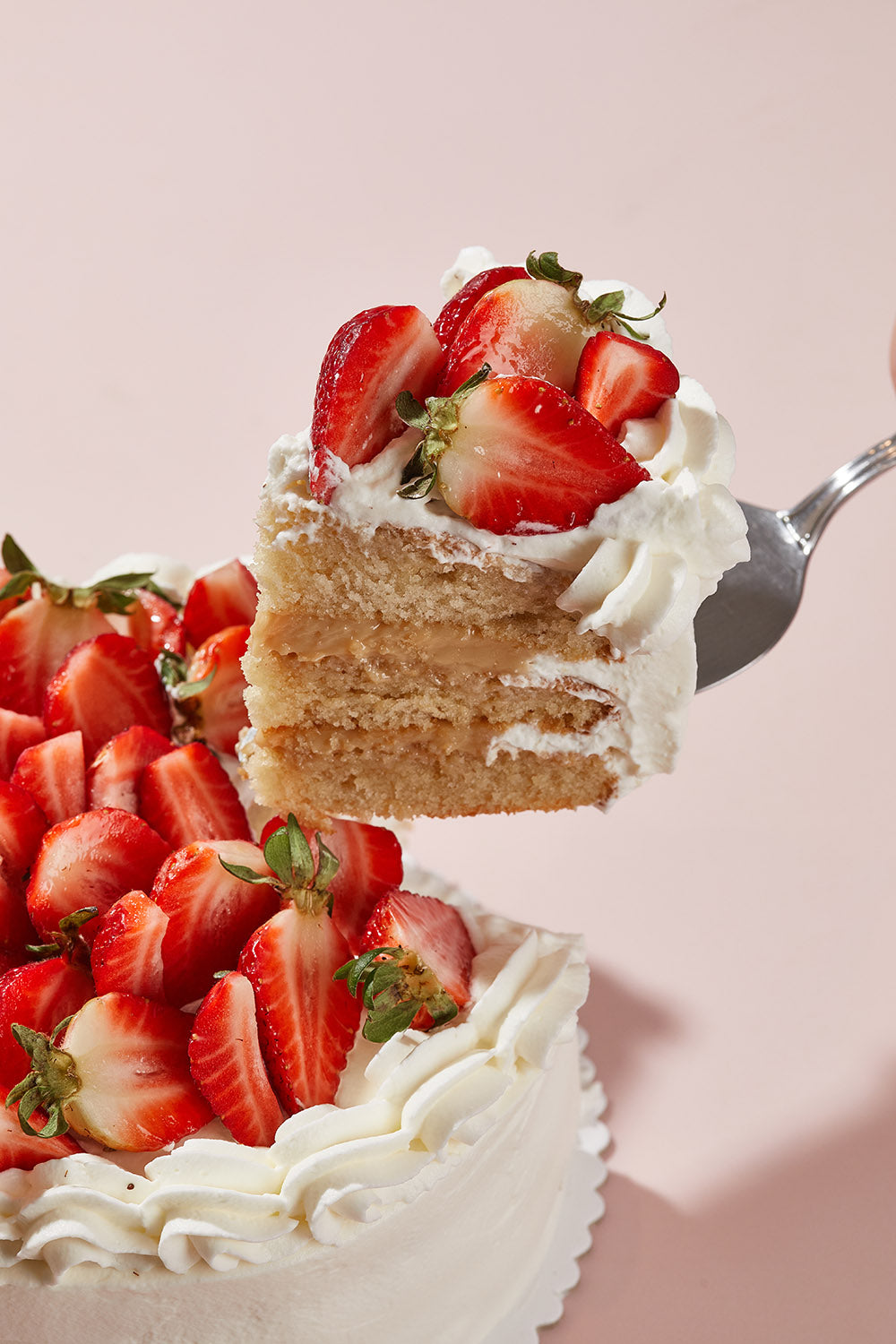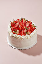 Torta de vainilla, rellena de manjar de olla, bañada en crema batida y coco rallado. Lleva fresas en toda la superficie.